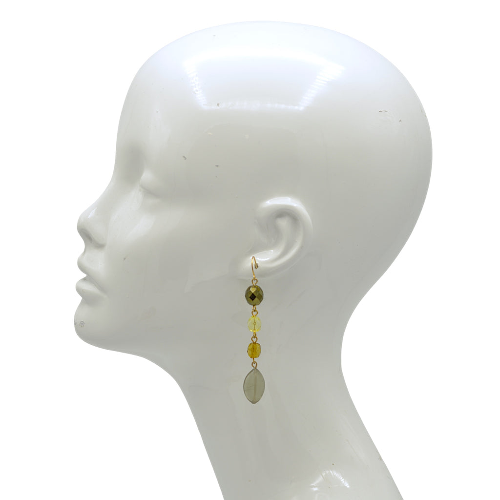 The design begins with a dark olive faceted bead, followed by translucent yellow and amber faceted accents, and is finished with a smooth, translucent olive-grey teardrop bead for a graceful drop. Suspended from polished gold-tone fishhook wires, these lightweight earrings provide effortless movement and a bold, artisanal look. Whether worn alone or paired with a matching beaded necklace, they are a versatile staple for any bohemian jewelry collection.