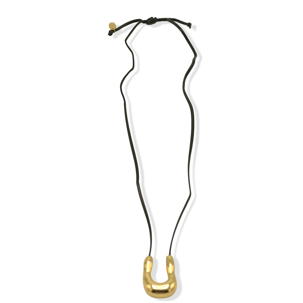 Make a bold, minimalist statement with this Modern Sculptural Gold-Tone U-Pendant Necklace. Featuring a unique, high-polish "U" or horseshoe-shaped pendant, this piece serves as a striking focal point for any contemporary outfit. The sculptural pendant is suspended from a thin, matte black faux leather cord that provides a sleek, high-contrast backdrop to the brilliant metallic finish.