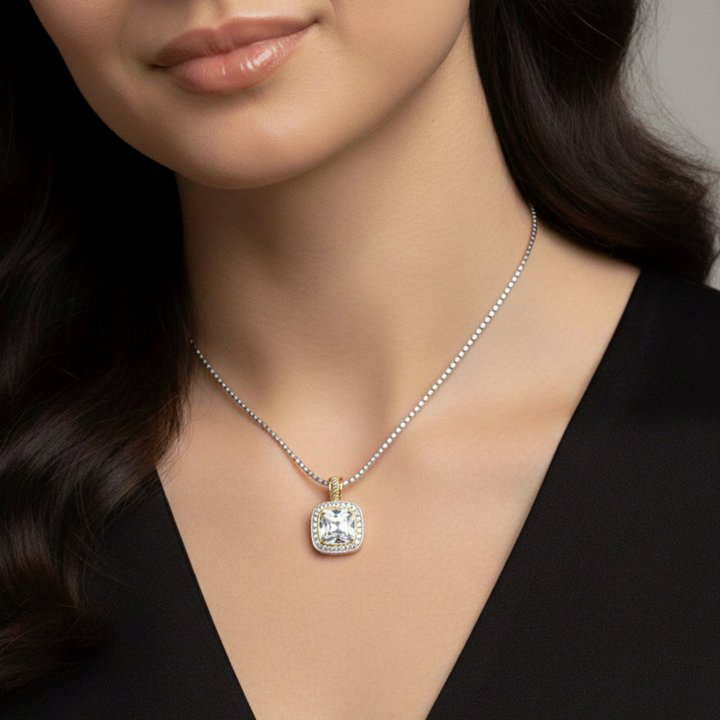 TWO TONE SQUARE CLEAR CRYSTAL AND RHINESTONES ENGRAVED PENDANT BOX CHAIN NECKLACE #93099EH-CLEAR FF12
