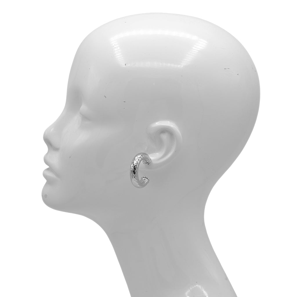 These chic, petite Silver-Tone Huggie Hoop Earrings are the perfect everyday accessory. Featuring a bold, thick C-hoop shape, the surface is entirely covered in a striking textured, hammered finish that brilliantly catches the light, giving the appearance of rich gold. The substantial yet small design measures approximately 1.25 inches in width/thickness, offering a statement look without being oversized. They are secured with a standard post-back closure(for pierced ears) for comfortable and reliable wear.