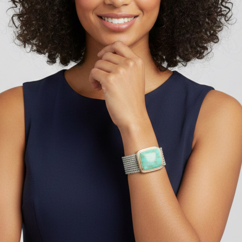 Two Tone Multi-Strand Bracelet with magnetic closure. Accented with a two tone rectangular center piece in Turquoise.