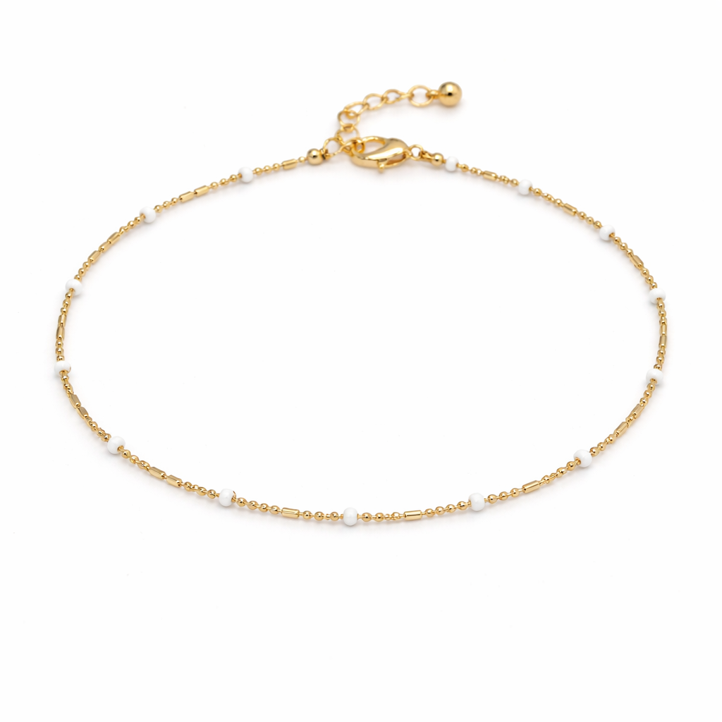 Elevate your everyday style with this elegant gold anklet featuring delicate white accent beads for a refined, modern touch. Designed with a lightweight adjustable chain, it sits comfortably on the ankle while adding a subtle shimmer to any look. Perfect for layering or wearing alone, this minimalist anklet blends timeless sophistication with effortless versatility — ideal for casual wear, beach outfits, or dressy occasions.
