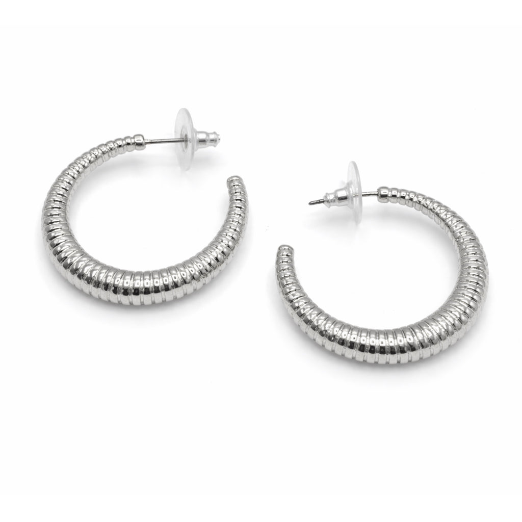 hese silver textured hoop earrings bring a modern twist to a timeless classic. Featuring a ribbed, beaded design with a polished silver finish, they add subtle dimension and shine without overpowering your look. Lightweight and comfortable, these hoops are perfect for everyday wear while still making a refined statement. Shown on model for a true-to-size fit and natural ear placement