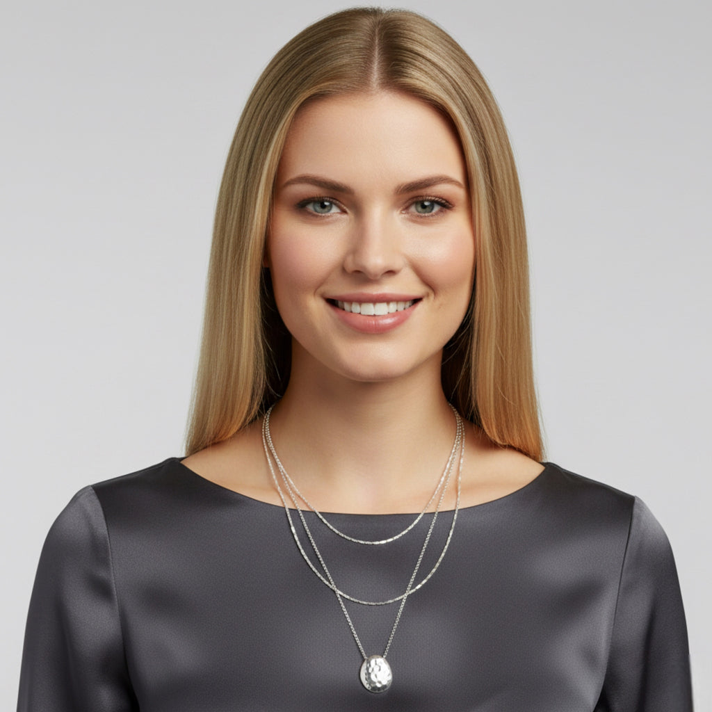 Artisanal Hammered Pendant: The longer necklace showcases a round, metallic medallion with a unique, organic hammered texture.