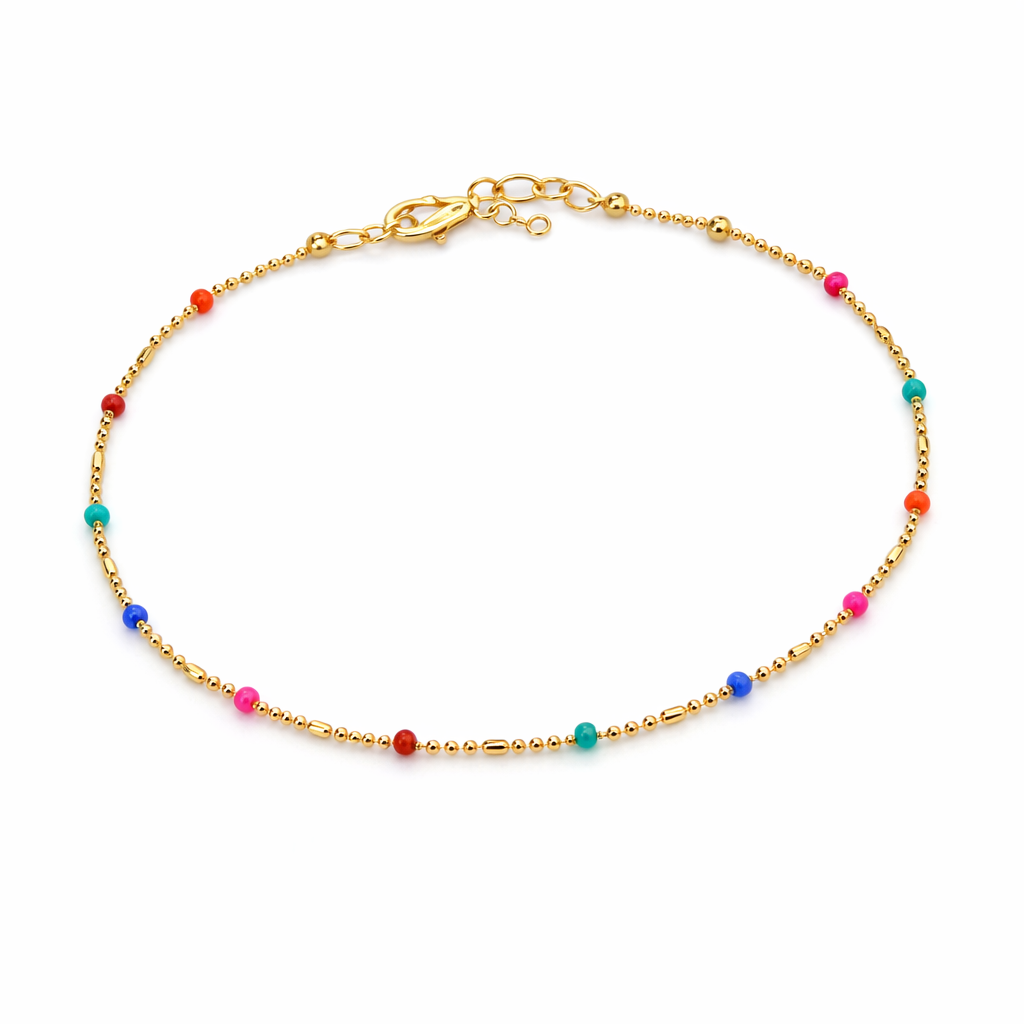 Elevate your everyday style with this elegant gold anklet featuring delicate Multi color accent beads for a refined, modern touch. Designed with a lightweight adjustable chain, it sits comfortably on the ankle while adding a subtle shimmer to any look. Perfect for layering or wearing alone, this minimalist anklet blends timeless sophistication with effortless versatility — ideal for casual wear, beach outfits, or dressy occasions.